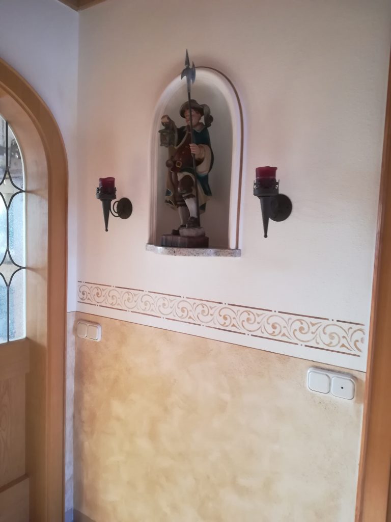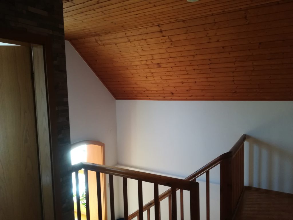 – Hier wurde nach mehreren Oberflächenrissen an den betroffenenen Teilflächen ein Gewebe eingearbeitet und anschließend die gesamte Oberfläche neuer Feinputz aufgetragen.Anstrich ganz klassisch in weiß gewählt, da dass Zusammenspiel am besten mit vorhandener Holzdecke wirkt.Dekorativer Akzent wurde mit einer Steinoptik-Vliestapete gewählt.