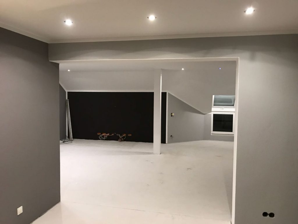 – Dem Kunden war eine schlichte Raumgestaltung in zwei verschiedenen Grau-tönen wichtig. Dazu kommt eine Highlight-Wand in Schwarz, an der sich später das TV-Gerät befinden wird. Passend zu den Sockelleisten wurde Wert auf eine weiße Bordüre gelegt.