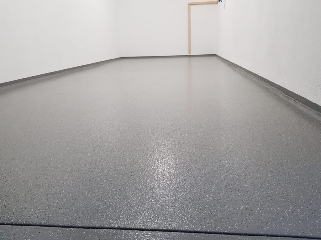 – Hochwertige, rutschhemmende 2K Epoxidharz Bodenbeschichtung …mit Quarzsand abgestreut und mit Farb-Chips dekorativ gestaltet