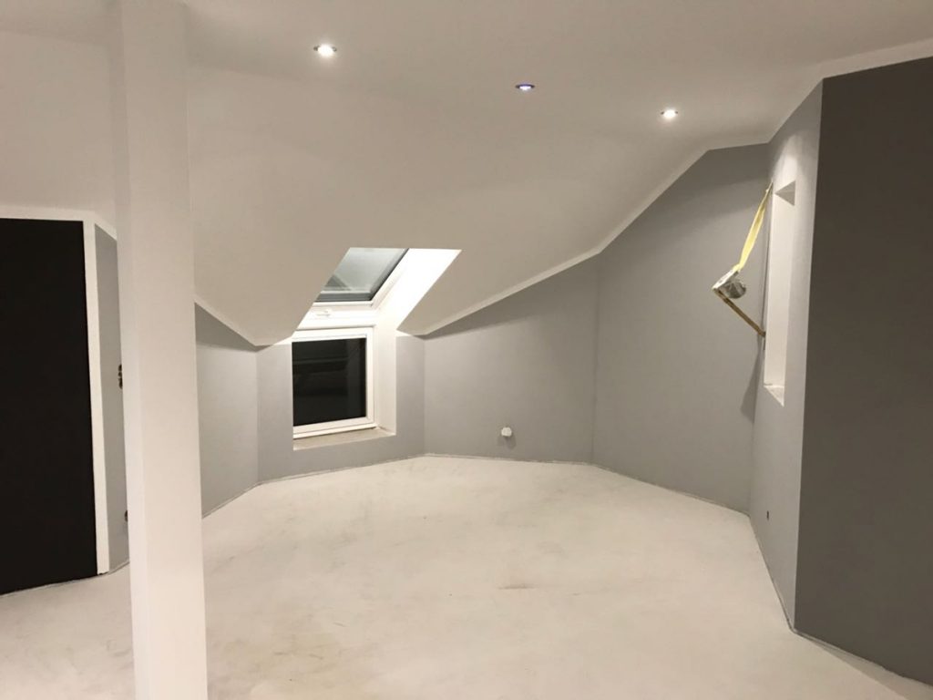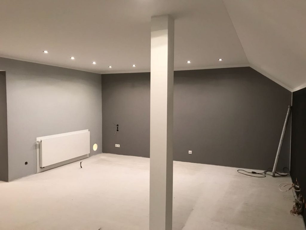Dem Kunden war eine schlichte Raumgestaltung in zwei verschiedenen Grau-tönen wichtig. Dazu kommt eine Highlight-Wand in Schwarz, an der sich später das TV-Gerät befinden wird. Passend zu den Sockelleisten wurde Wert auf eine weiße Bordüre gelegt.